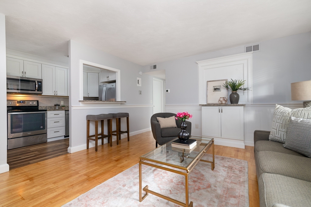 This freshly painted two-bedroom, one-bath, pet-friendly condo in Braintree Gardens features new carpeting, granite countertops, and stainless steel appliances. Conveniently located near major highways, Weymouth Landing/East Braintree Station/Greenbush Commuter Rail, Braintree Red Line, shopping, and restaurants. This immaculate first-floor end-unit is rarely available in this highly sought-after location due to its exceptional setting. Central A/C with a new condenser and newer air handler ensures year-round comfort, while attractive wood flooring flows throughout the main living areas, complemented by new carpet in the bedroom and vinyl flooring in the additional room. Enjoy the tranquil sounds and calming water views of the Monatiquot River, which flows directly by the parking area, creating a serene natural backdrop. Heat and hot water are included in the condo fee, and on-site laundry adds to the appeal. Assigned parking with plenty of visitor parking. Welcome to your new home!